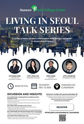 Itaewon Global Village Center will be hosting its third “Living in Seoul Talk Series” on December 13, 2025 (Saturday) from 09:30AM to 5:10PM at Itaewon Global Village Center.