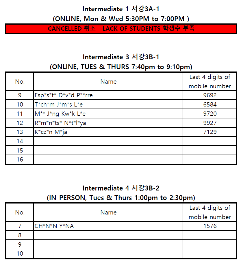 Intermediate 1(서울대3A-1) Class has been cancelled due to lack of students.